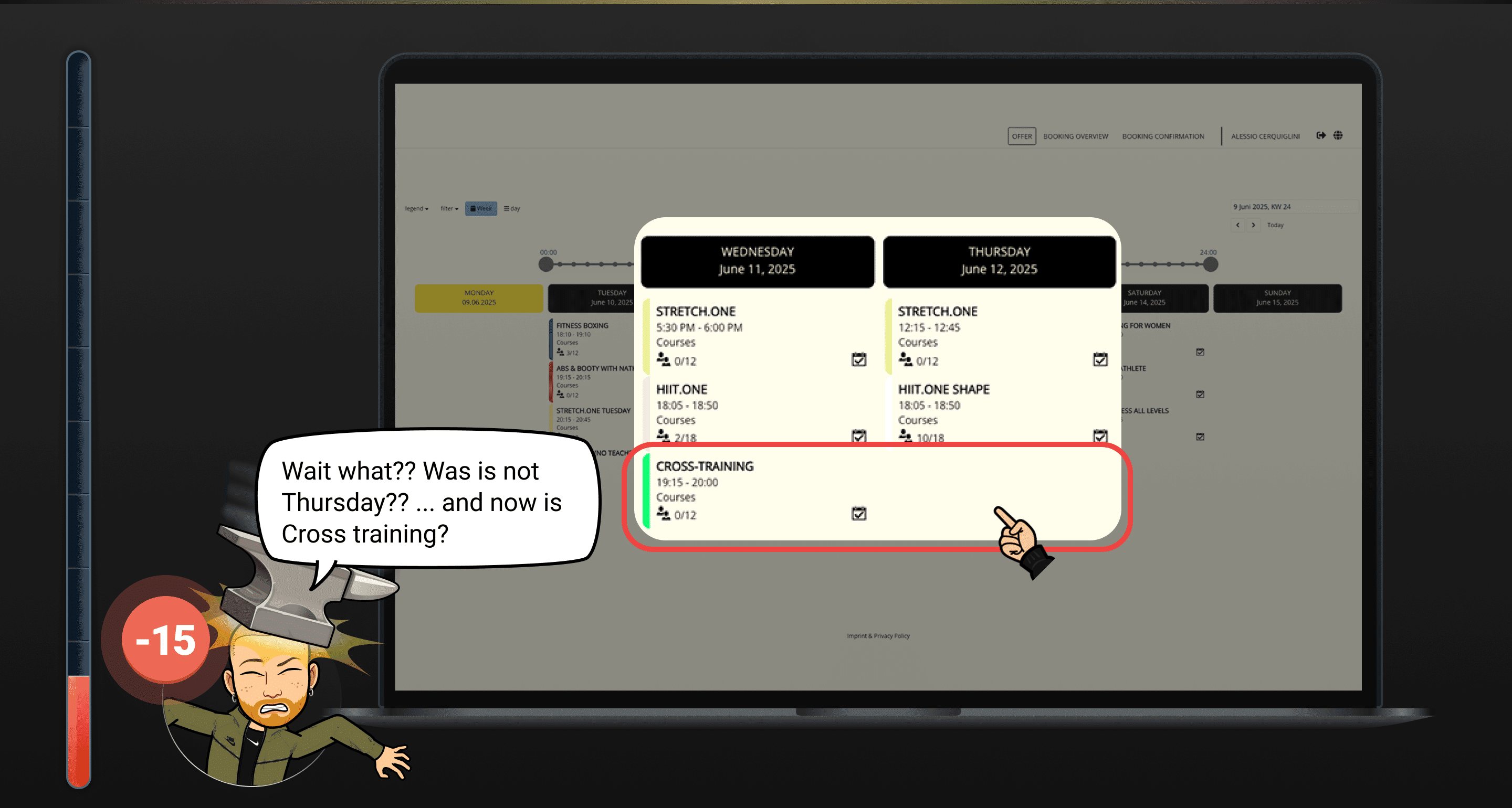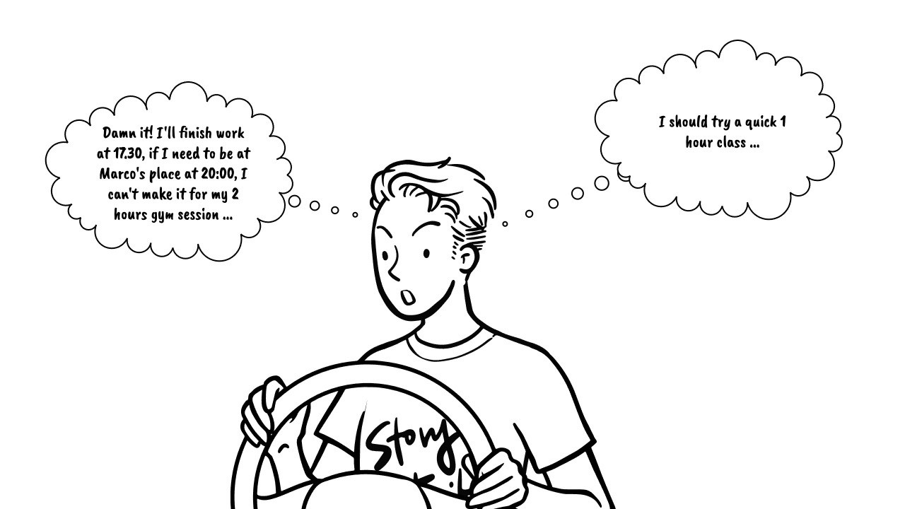 His goal is to try a new class, because he has a limited time for his day and can’t complete his weight workout.