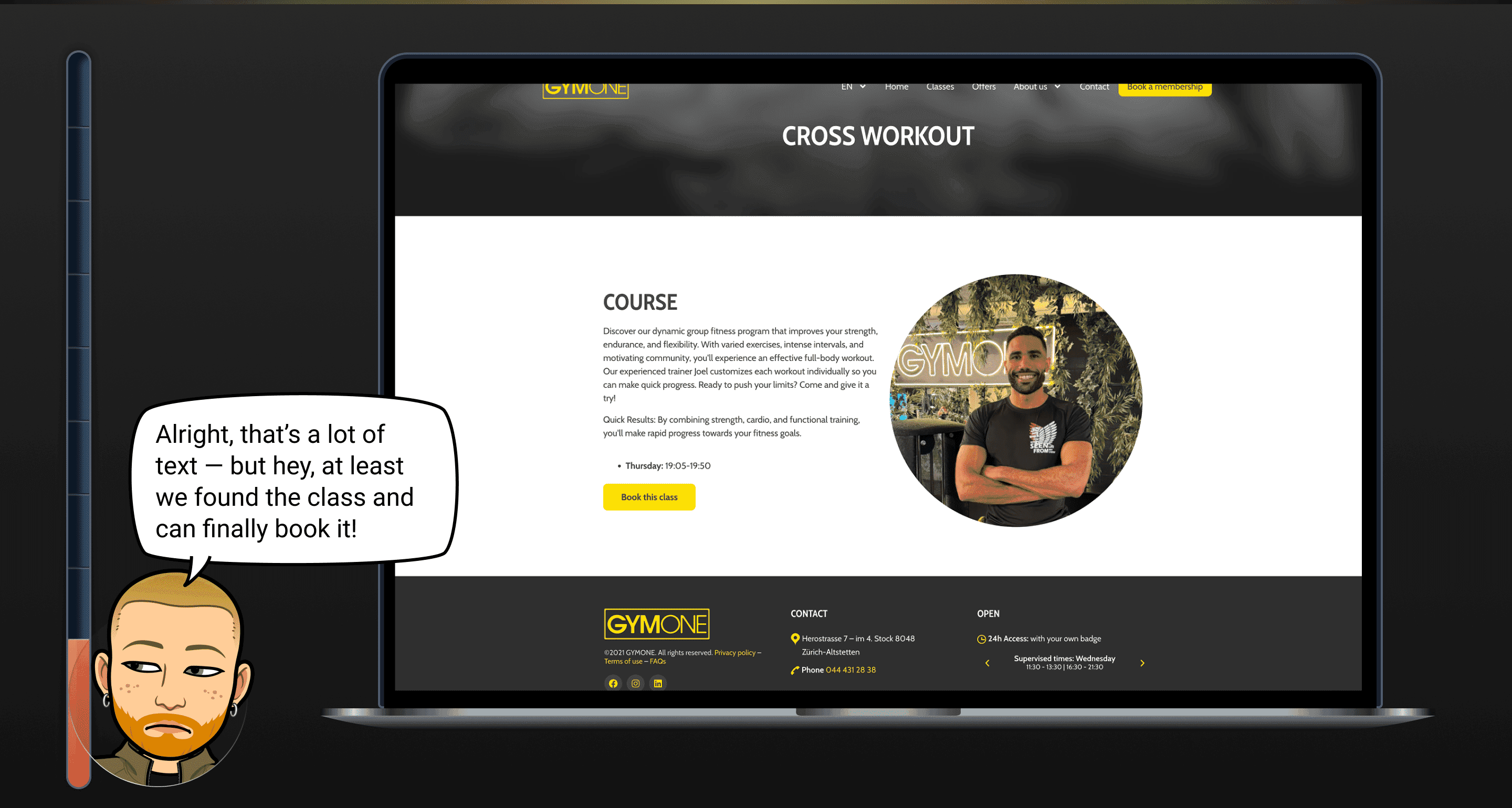 It was observed that 1 out of 2 participants was unsure what to do after having booked a test training. To fill the pit one solution could be to add a guide, for example “What to expect in your first week” or mark the transition with a personalised noted from a personal trainer.