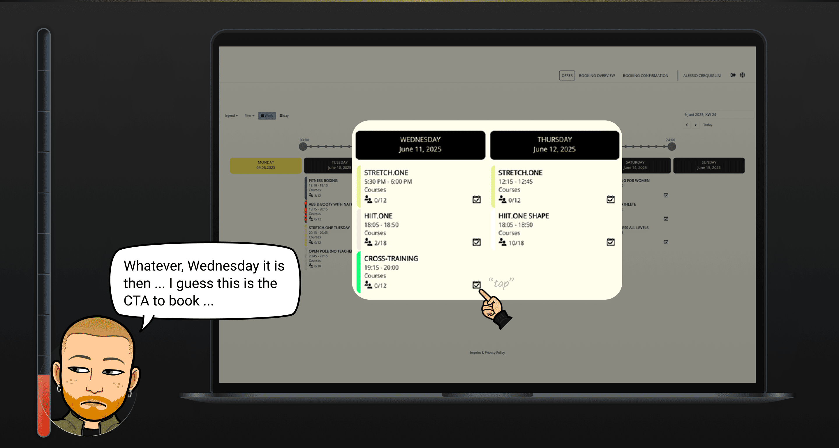 It was observed that 5 out of 5 participants dropped off when trying to book a class. This means that the booking process is highly problematic and does not support successful completion.