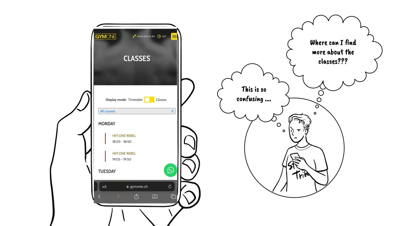 Additionally, key parts of the experience such as booking a class or purchasing a membership redirected users to external platforms that didn’t support English, making the process even harder for non-German speakers.