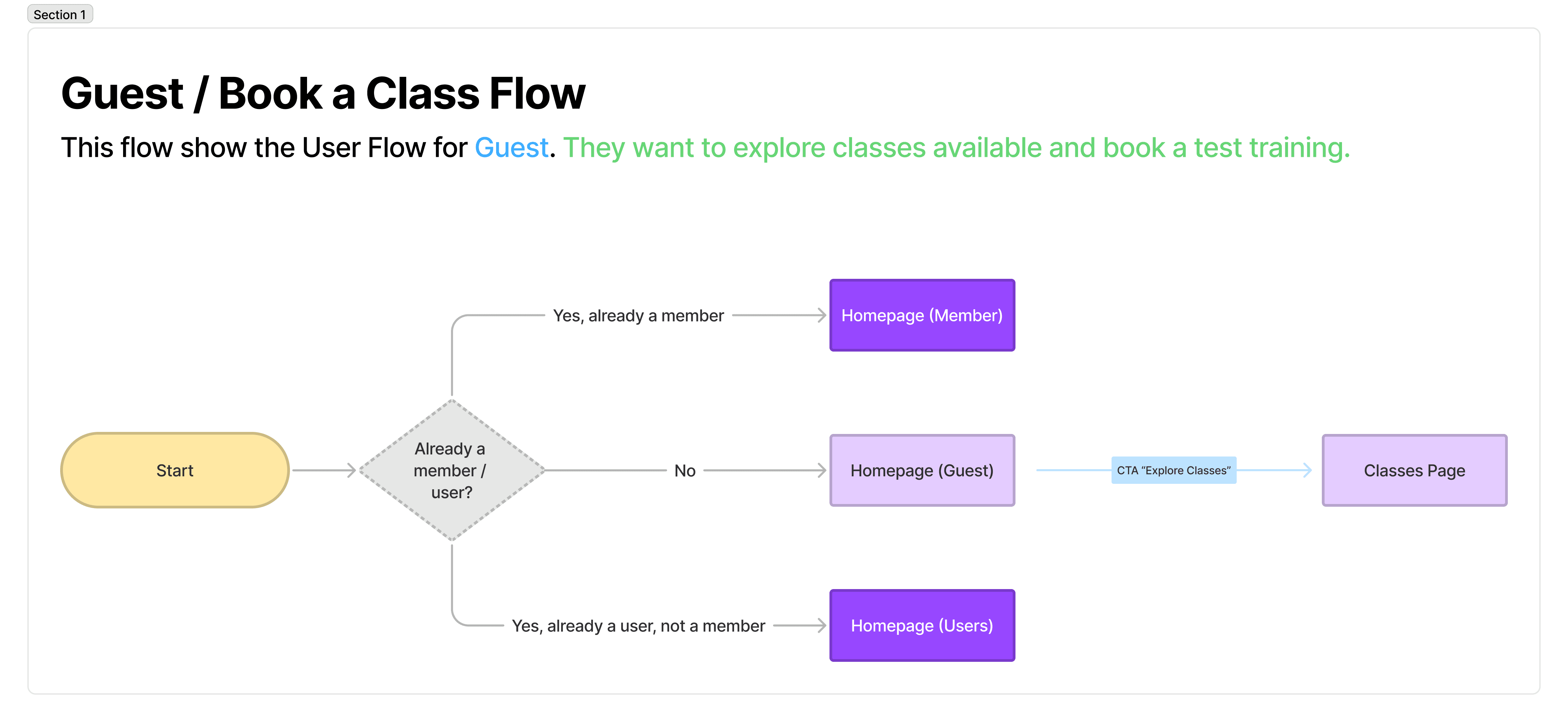 While mapping out the two main flows (booking a class and purchasing a membership) I realised that the website actually serves three distinct types of primary users. Defining these user types was essential, as each would require a slightly different UI on key pages such as the homepage and throughout the booking process.