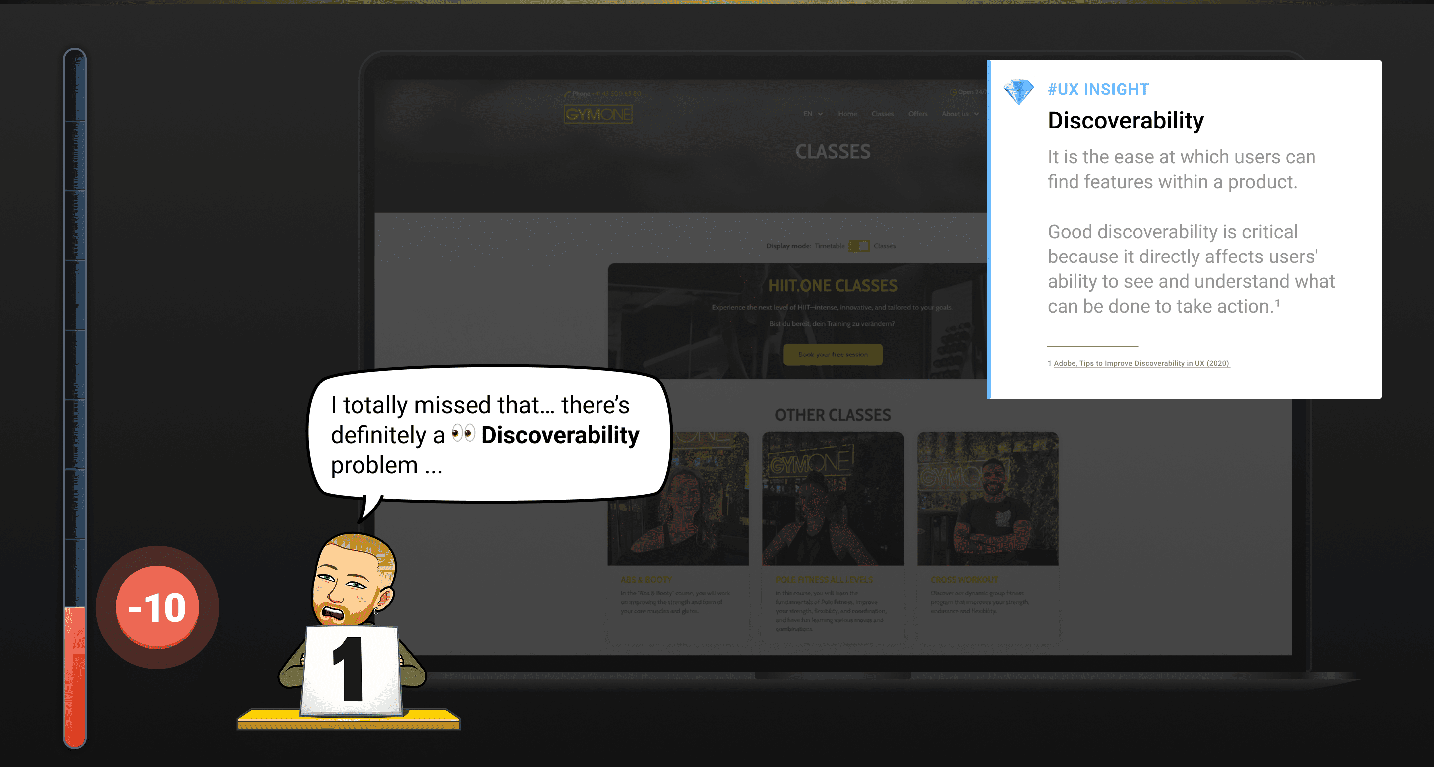 An initial evaluation revealed 26 usability issues across Gymone’s core website functions: class booking, membership purchase and membership management. Four most impactful findings were: