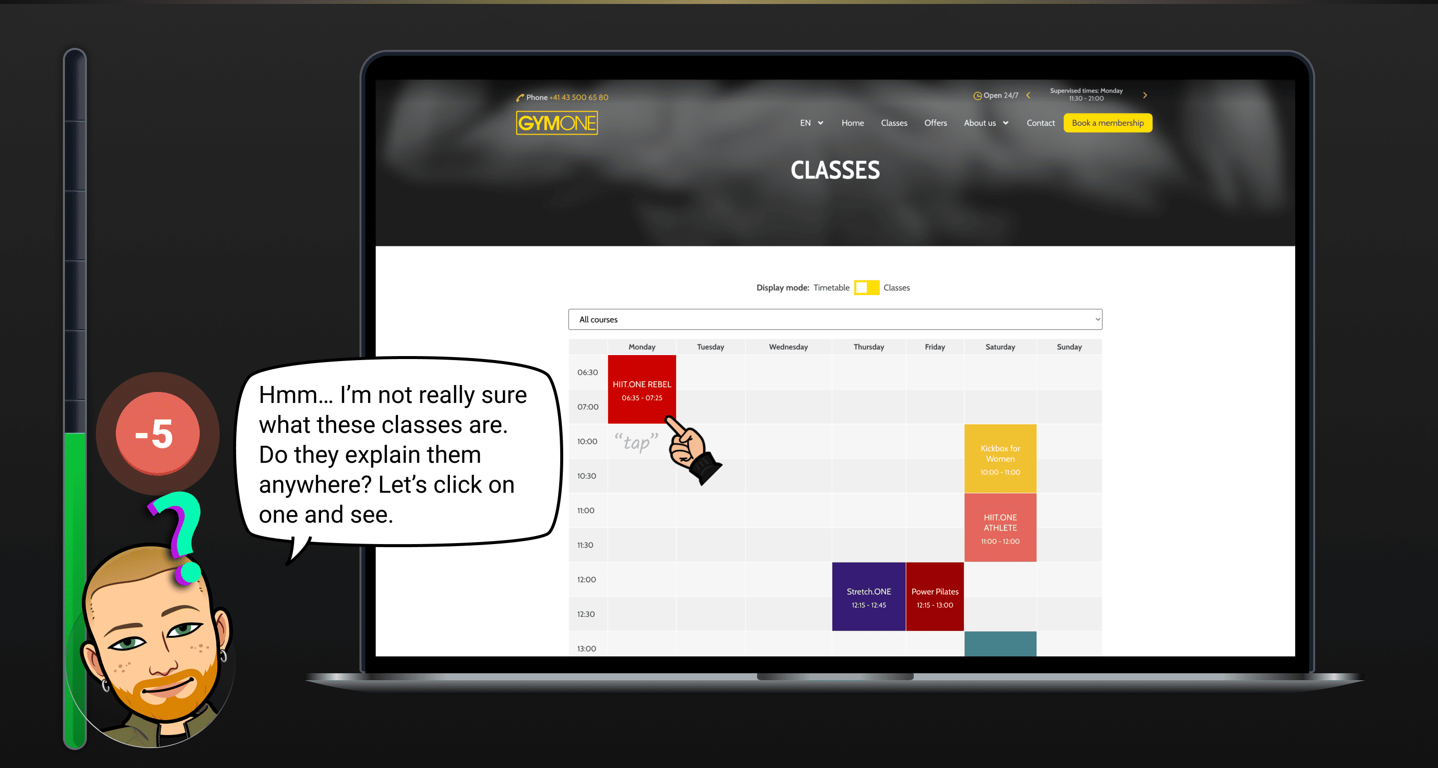 It was observed that 5 out of 5 participants could not find information about available classes. This means that users lack access to essential class details, which prevents them from exploring offerings and booking.